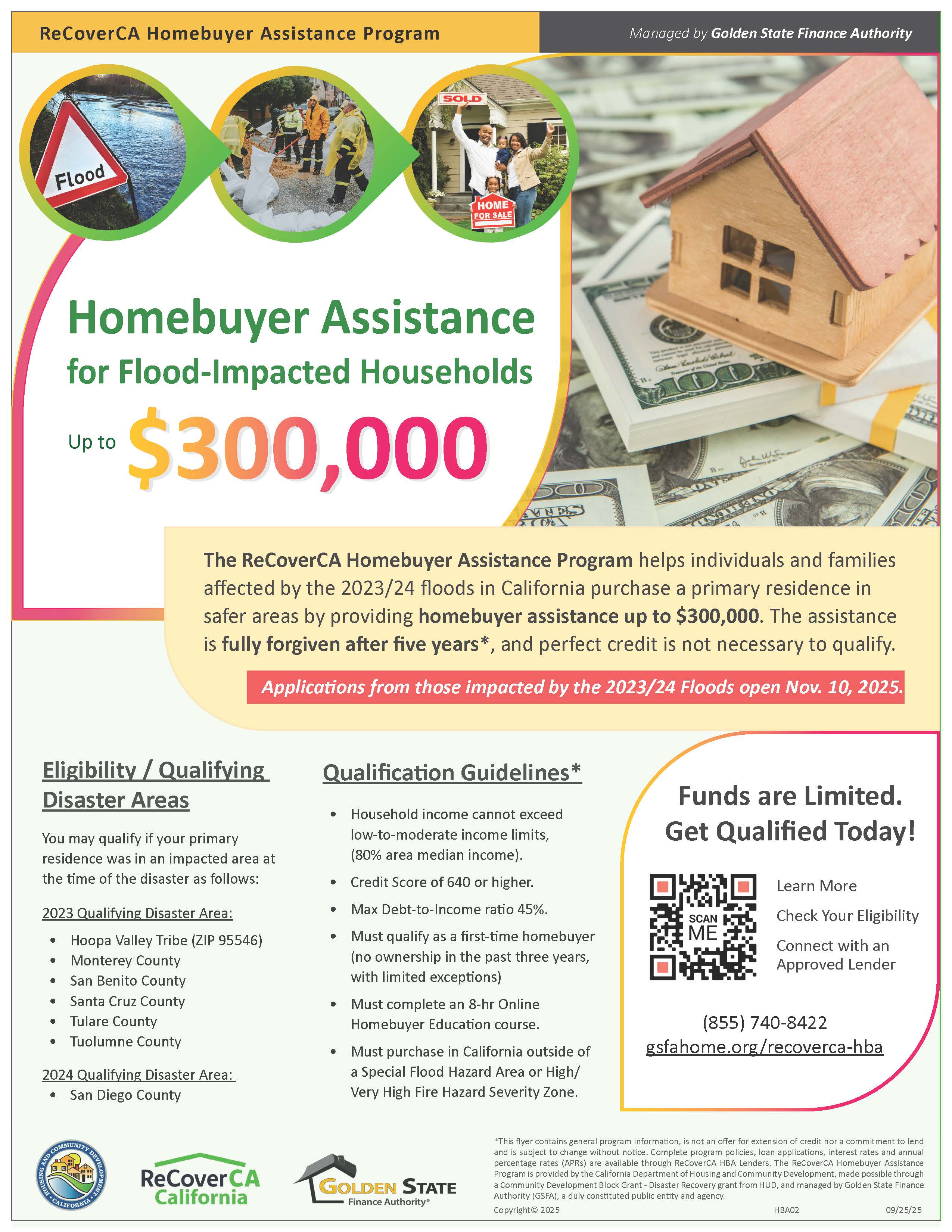 The ReCoverCA Homebuyer Assistance (DR-HBA) Program is provided by the California Department of Housing and Community Development (HCD) in collaboration with GSFA as Program Manager. Funding for the Program is made possible through a Community Development Block Grant - Disaster Recovery (CDBG-DR) grant from HUD.