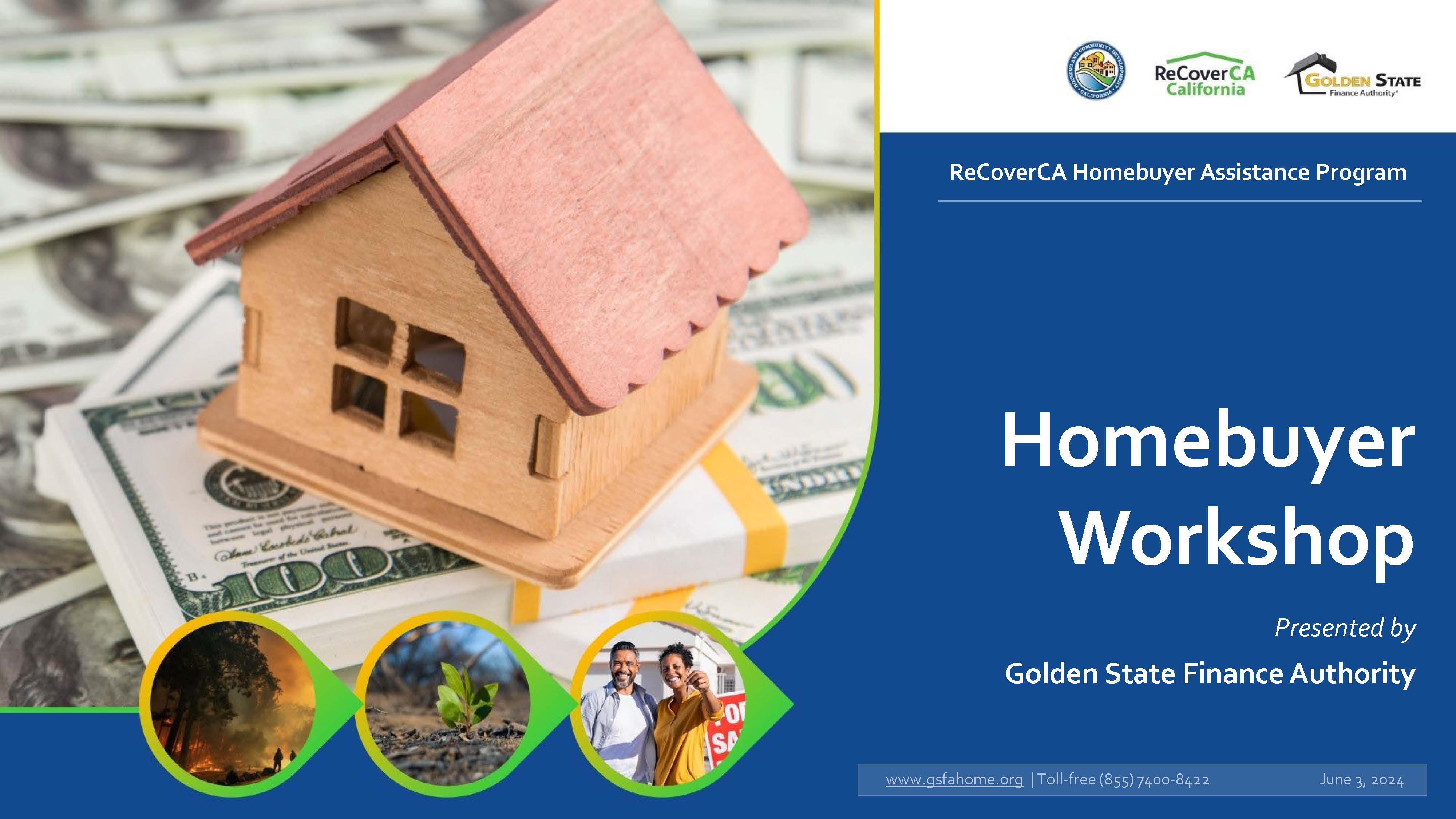 The ReCoverCA Homebuyer Assistance (DR-HBA) Program is provided by the California Department of Housing and Community Development (HCD) in collaboration with GSFA as Program Manager. Funding for the Program is made possible through a Community Development Block Grant - Disaster Recovery (CDBG-DR) grant from HUD.
