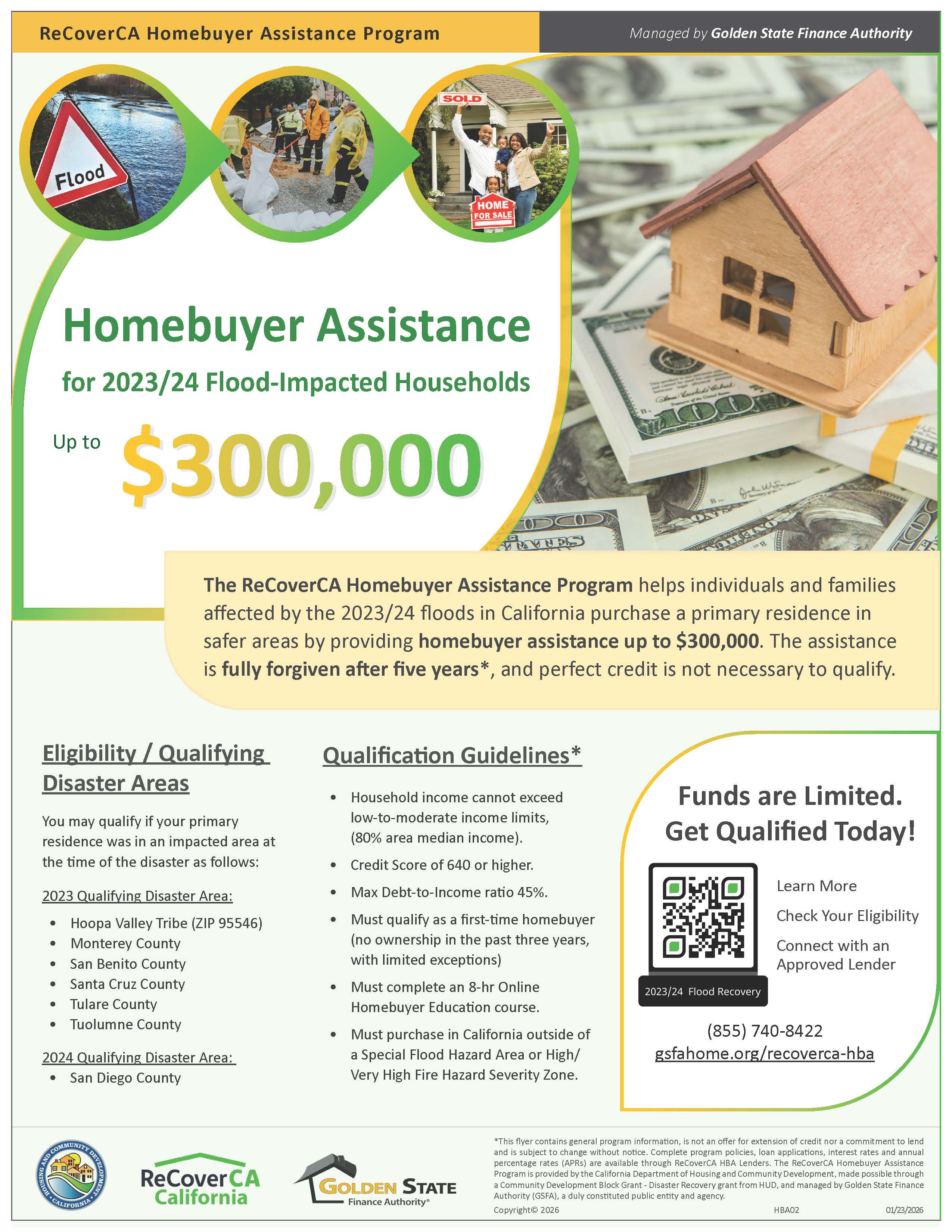 The materials below are specific to the 2023/24 Flood Recovery funding under the ReCoverCA Homebuyer Assistance Program and are provided for general informational purposes only. For complete program policies, eligibility guidelines, applications, interest rates, and APRs, connect with a ReCoverCA HBA Lender. Many lenders offer assistance in multiple languages to support you throughout the process.