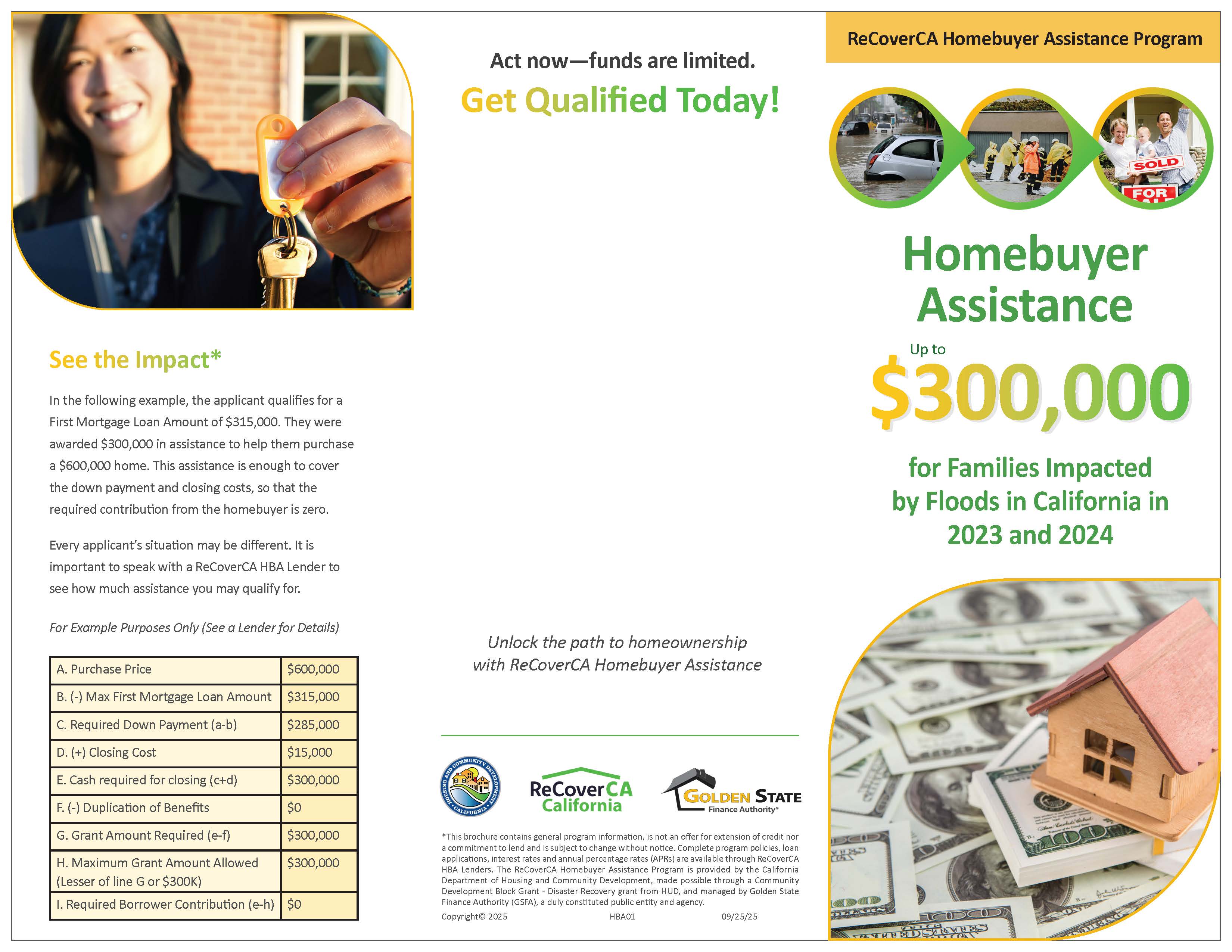The ReCoverCA Homebuyer Assistance Program provides up to $300,000 in forgivable loan assistance to help low- and moderate-income households impacted by the 2023 and 2024 California floods to help them purchase homes in safer areas of California.