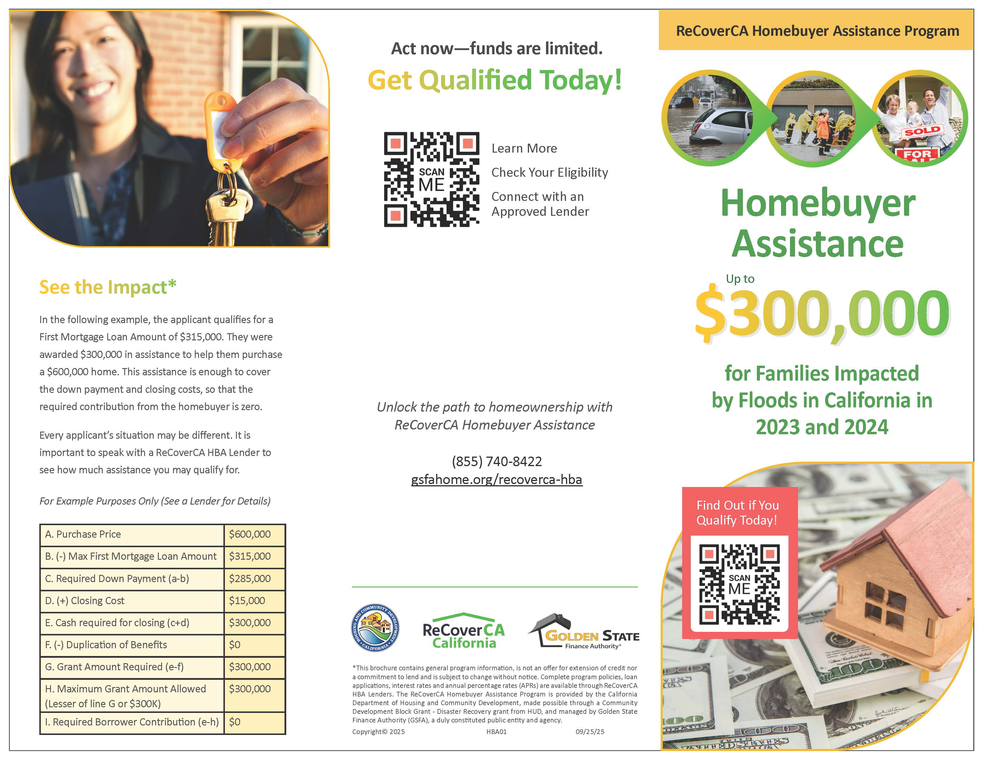 The ReCoverCA Homebuyer Assistance (DR-HBA) Program is provided by the California Department of Housing and Community Development (HCD) in collaboration with GSFA as Program Manager. Funding for the Program is made possible through a Community Development Block Grant - Disaster Recovery (CDBG-DR) grant from HUD.